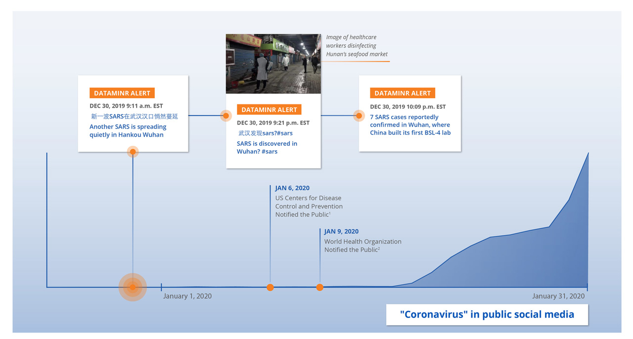Dataminr says it had early warnings on the virus via social media. “In late 2019, an outbreak of respiratory disease caused by a novel (new) coronavirus—now known as COVID-19—simmered for weeks in Wuhan, China before claiming its first victim on January 10, 2020. Dataminr first detected the outbreak of COVID-19 within public social media posts at 9:11 a.m. EST on Dec 30, 2019, providing clients with the earliest warning in advance of the U.S. government’s announcement 7 days later.”