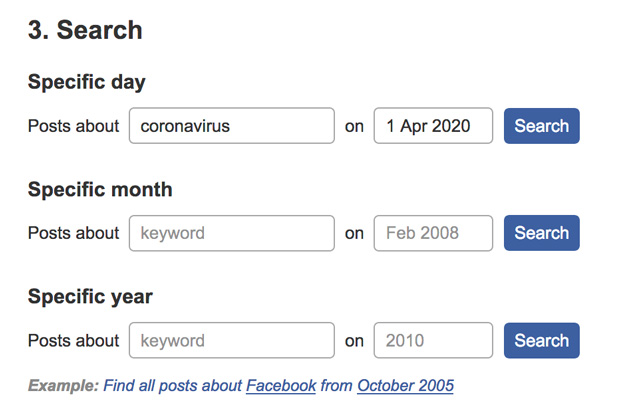 When you want to search on a specific date, you can search by year, by month from a specific year or for a specific date. It is also possible to use two or more keywords like terror attack Paris. You can also search posts in between two specific dates. It is possible to search in between two years, in between months of different years and in between two specific dates.