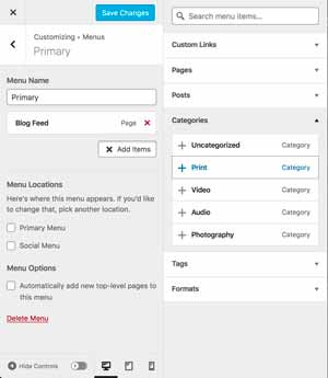 To add a menu, you must first have created and published the pages you want to add. You also need to create the categories for the posts. To create categories, you can Add a post and then go to the Page options in the right hand column. (If you don’t see the Page options, click on the black box with a white gear inside.) Scroll down to categories and Add New. Hit return after you do so it will register.