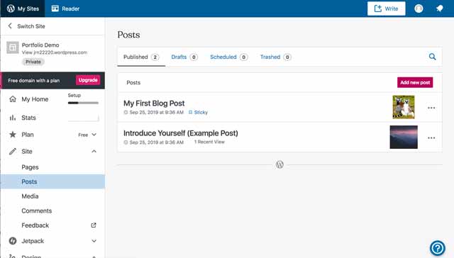 Click on Posts from the main menu. Click on the fushia button on the right that says “Add a Post” or on the +Write button at the very top right.