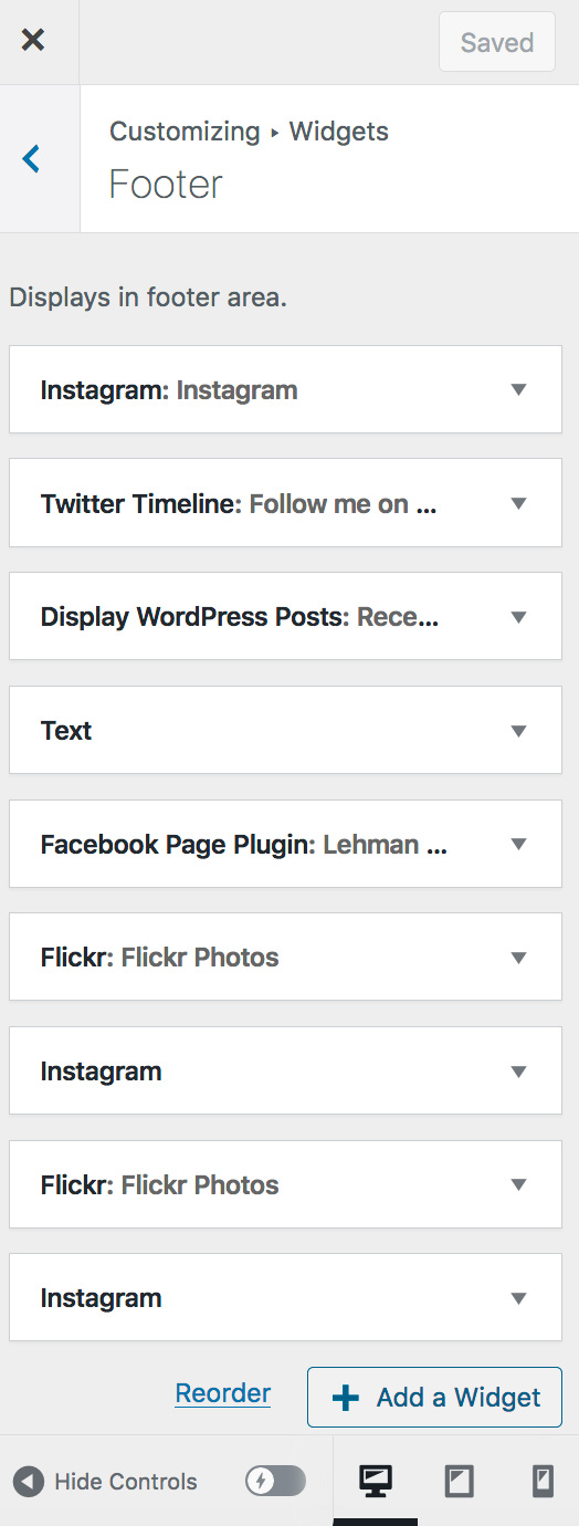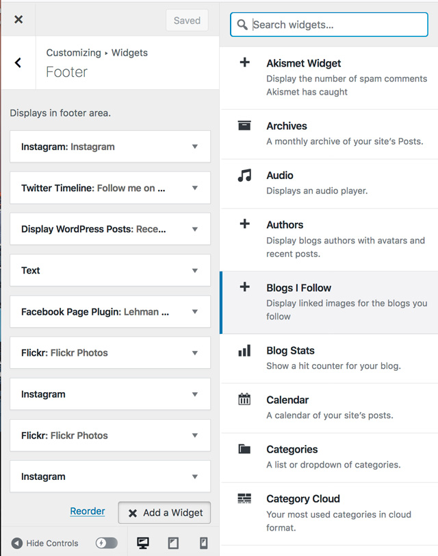 Go to Customize > Widgets. Select four of the available widgets and add to the footer. The order determines which column they appear in. If possible, select your social media accounts. Recent posts is another effective widget as it offers a secondary navigation of your content. Facebook requires the URL of your page, Twitter your handle. Instagram requires you to give WP permission to include the feed.