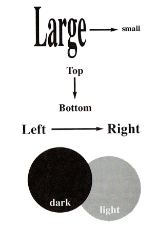 Dark to light: We look at darker items first and lighter items second because the former are easier to see.Designers must use these principles of visual logic to establish hierarchy and communicate relative importance of content to users. Source: Web Journalism, James Stovall