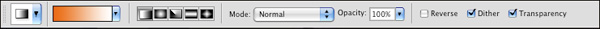 2) In the tools panel, select the gradient tool (under the paint can). Select a bright orange color for the foreground. In the options bar, make sure the linear gradient is selected. In the options bar, click the arrow next to the gradient editor to open up the gradient picker and chose the foreground to background swatch.