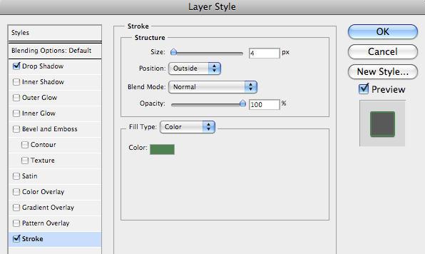 4) Select the Hawaii layer, click the fx button to add a layer style. Choose stroke from the menu. Settings should read: size 4px, position outside, blend mode normal, opacity 100%, color green. Click OK.