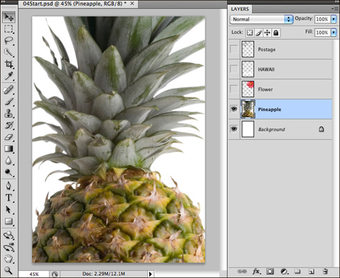 Now the working file has six layers, some visible, some hidden. Click the eye icon next to the pineapple layer to hide the image. You can hide or show a layer by clicking on the icon or in the Show/Hide column. Click again to show it.