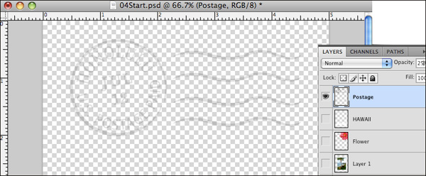 1) Select the postage layer and click on the arrow next to opacity. Drag the slider to 25%. Save.