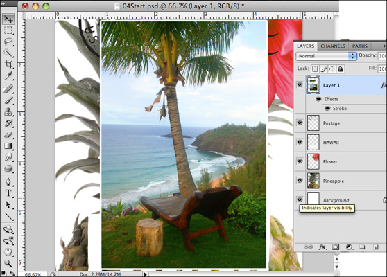 1) Make the remaining layers visible by clicking on the Show/Hide visibility column. Select the beach layer and drag it up between the pineapple and flower layer.